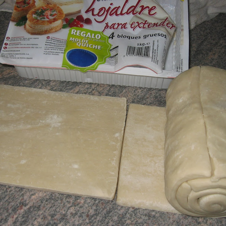 Se tendrá así una sola tira hecha con las cuatro sobrepuestas y separadas por una ligera capa de grasa o manteca. Dejar enfriar en la heladera. Arrollar sobre sí mismas las cuatro tiras reunidas, comenzando por un extremo. Proceder con cuidado y exactitud y arrollar hasta el fin; resultará una especie de arrollado de 12 a 15 cm de largo y de 6 a 7 cm de diámetro. Tomar un cuchillo filoso y recortar cualquier pequeña saliente que pudiere aparecer en los extremos del arrollado. Con el mismo cuchillo marcar pequeñas incisiones distanciadas 1 cm o menos una de otra. Cortar por las mismas con cuchillo espolvoreado con harina. Las tajadas deben ser iguales y en forma de espiral. Llevar a la heladera 20 minutos. línharinar ligeramente la mesa y estirar cada disco por separado con un palote liviano, oprimiendo suavemente desde el centro hacia los bordes, lo que dará a cada espiral una forma algo ovalada, aumentando su tamaño en un cincuenta por ciento.