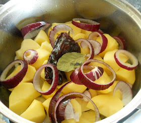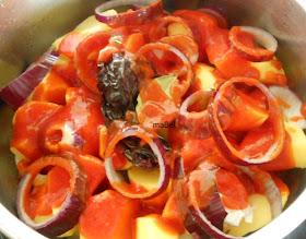 otra capa de 1 kg patatas en cachitos, otra mas de cebollas. Aquí podemos colocar también tiras de pimientos.