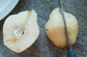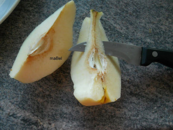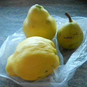 Para saber que son los membrillos, son una fruta de forma parecida a una pera, pero gigante y muy dura. Fíjate en esta foto la diferencia, la pequeñita es una pera normal, para que compares.
