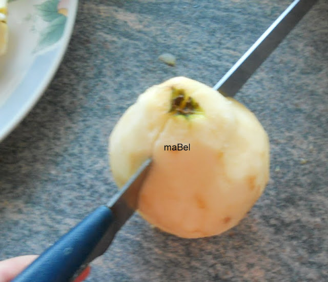 Como te explicaba, es una fruta muy dura, para quitarle la piel, usamos un pelapatatas o pelapapas.