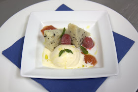 Para presentarles este helado, me inspiré en la creación del profesor y Chef Juan Gonzalez Cutiño, y su ayudante Julio Andres Vazquez, de La Escuela de Hosteleria La Laguna. Se trata de un bizcocho de aceite de oliva extra virgen con olivas negras, helado de aceite de oliva y mermelada de tomate.