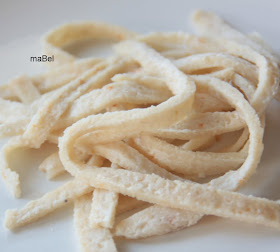 Había visto en el supermercado estos tallarimis, y me llamaron la atención. Luego pensé que los podía hacer en casa y compartir la receta para todos aquellos que no lo consiguen o quieren comer pasta o algo parecido, por lo menos en la forma, y están haciendo dieta. Se puede combinar con cualquier salsa para pasta.
