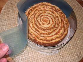 y luego ajustamos la cintura de metal al diametro del carton de abajo. Tambien podemos utilizar un molde desmontable, que el tamaño sea mayor que el de la torta.