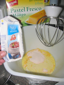 Yo utilice este pastel fresco de mango, y lo puse a batir con 300 cc de leche y 200 cc de nata para montar (crema de leche)