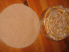 Cortamos un carton al que le pegamos un papel manteca, de diametro mayor que la torta ( que exceda unos 2 cms mas o menos)