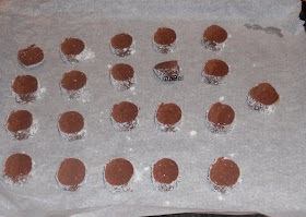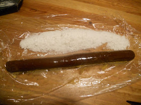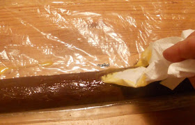 hacemos un gran cilindro de mas o menos 2 cm de diámetro. Lo envuelves en film, y lo dejas en el congelador o freezer, 1 hora hasta que se ponga bien duro