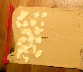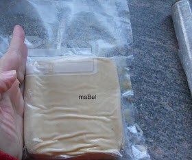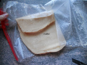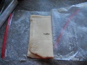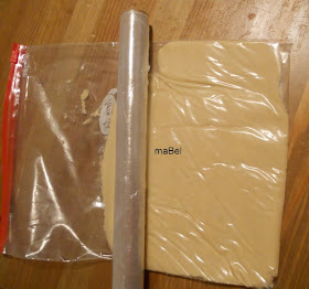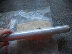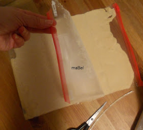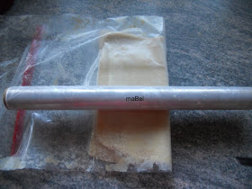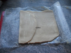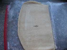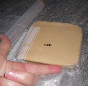Estiramos la masa, y la guardamos en el frigorífico media hora. Como es poca cantidad, yo la meto en una bolsita, y la estiro ahi dentro, asi me es mas fácil meter en el frigorifico despues.