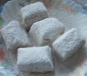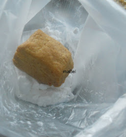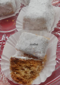 y estando calientes, las pasamos por azucar glase o impalpable. Pones 3 cdas de azúcar glace dentro de una bolsa, y metes de a una las hojaldrinas hasta que queden bien blancas.