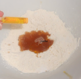 hago un hoyo en la harina, y coloco el líquido dentro, junto con la esencia o ralladura, y esparzo la sal y el bicarbonato, por encima de la harina