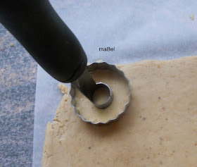 con un cortapastas redondo, y con un descorazonador de manzanas, formo el rosco. También lo que puedes hacer, es tomar bollitos de masa, de unos 35 gr, formar un cilindro, cerrarlo de forma de O y ya está, no necesitas tener cortapastas o vasitos, ni nada.