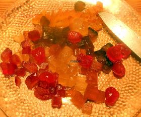 250 gr a 350 de frutas escarchadas, o glaseadas, confitadas, o mezcla con frutos secos (nueces, almendras, etc)