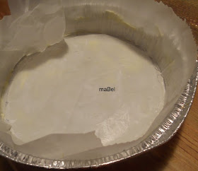y lo colocamos en un molde descartable (esos que son para patatas fritas o pollo, que son pequeños y altos) forrado con papel de horno, o papel manteca, pero de manera que el papel sobresalga bastante del alto del molde. Acuerdate de poner un disco de papel el el fondo también.