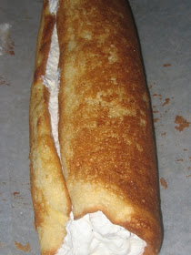 con esta crema de chocolate unto el pionono, y con un tenedor hago un rayado de forma que semeje un tronco, corto las puntas del bizcocho en diagonal, para emparejar y quede bonito