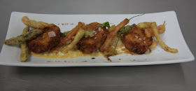 Medallones de ave escabechada villeroy, con huevos trasnaos y tempura de verduras