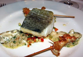 Bacalao al pil pil con kokotxas, brunoise de verduras y langostinos empanados,
