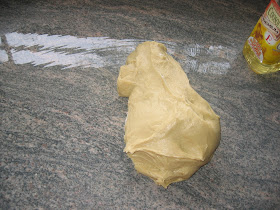 Una vez que la masa esta lista, bien lisa y elastica, la pongo sobre la mesada aceitada