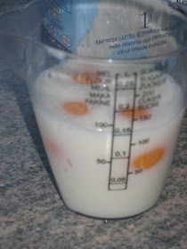 ponemos 4 yemas y le agregamos leche, hasta completar 150 cc
