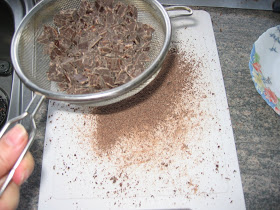Mientras, voy cortando 200 gr de chocolate para fundir y lo paso por un cedazo, para quitarle el polvillo de chocolate