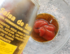 finalmente, para darle un color mas bonito, mezclo ketchup con salsa de soja y las pincelo