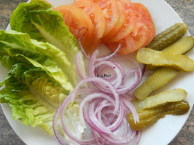 y luego los complementos, tomate, lechuga, pepinillos, cebolla roja, ketchup, mayonesa, mostaza, o la salsa que mas te guste.