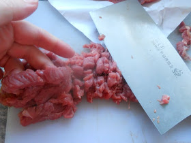 lo que hago a continuación en cortar la carne en tiras y luego en cubitos, es decir la pico a cuchillo. La ventaja que da hacerlo de esta forma, es que la carne, a pesar de ser magra, va a conservar sus jugos. Si lo picamos con la picadora o la compramos picada, las células se destruyen y hace que después el jugo de la carne se escape al cocinar.