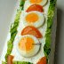 Pan integral, salmón ahumado, huevo cocido,, cebollas, pepinillos y alcaparras en vinagre.
