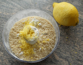 Mezclamos la harina de almendras, el azucar glase, con la maizena y la ralladura bien fina, de la piel de un limón