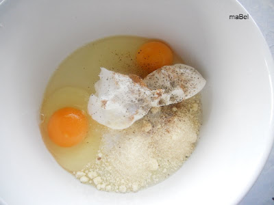 para 200 gr de hojas cocidas y estrujadas le pongo unos 100 gr de queso untable, 2 huevos, 2 cdas de queso rallado, sal, pimienta y nuez moscada