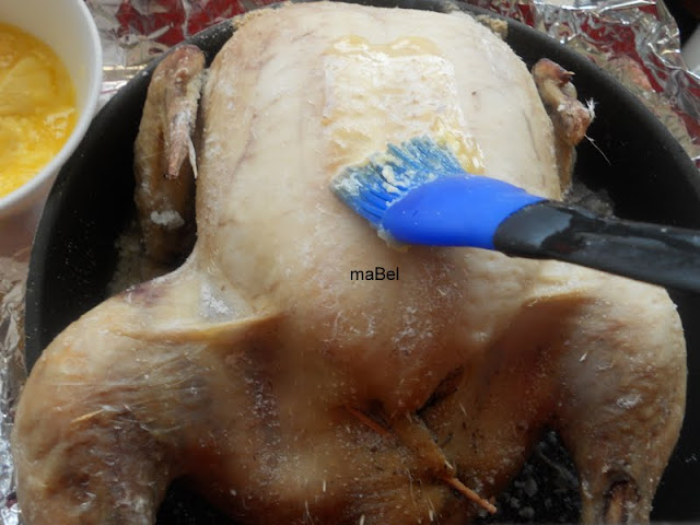 despues lo cubrimos con una capa de sal fina, bastante gruesita, no te preocupes que no va a quedar salado. Esto lo hago para deshidratar la piel del pollo, y que quede mas fina y suelte la grasa.