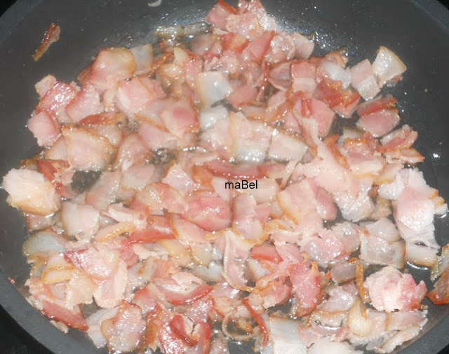 una vez que está crocantito, le quito el exceso de grasa y lo deshecho, y separo en dos partes iguales los trocitos de bacon.