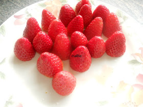 quitamos el cabito a las fresas, y cortamos un poco la base, de manera que queden todas a la misma altura. Los trocitos de fresa que cortamos, lo podemos usar para un batido, o armar una copa. No me tires nada!!!