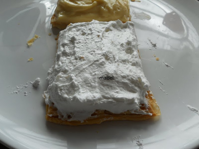 Despues se trata de colocar una capa de crema en una de las tres tiras, en la otra, una capa de merengue, y en la tercera una capa finita de merengue