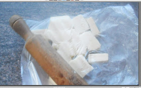 Cortamos la mantequilla en trocitos, y la metemos dentro de una bolsita. La golpeamos, y estiramos con un palote varias veces de manera que quede formado un cuadrado. Mas o menos el cuadrado es de la medida de una mano.