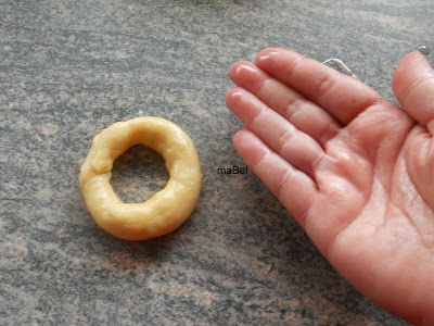 formas las rosquillas tomando un trocito de masa, haces un choricito finito, y unes las puntas, bien unidas, para que no se te abran al cocinar. El agujero hazlo bastante grande, porque despues crecen y te puedes quedar sin él. Si se te pega en las manos, puedes untarte apenas las manos con aceite, y también la mesada.