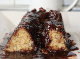 Desmoldar inmediatamente sacado del horno, y verás la torta mas increible con su salsa incluída. A mí me salió como dos montañas, ya que el café se lo volqué en el centro. Si la quieres pareja, entonces pon poco a poco el café de forma uniforme. Yo quería una piscina de salsa encima!!!!