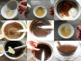 Se mezcla el azucar con el cacao y la nata. Se lleva al fuego revolviendo continuamente, y una vez que hierva, contar 4 minutos.
