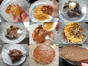 Se derrite el chocolate con la mantequilla a bañomaría o en microondas en modo descongelacion. Se le mezcla la pasta de avellanas y los copos triturados.