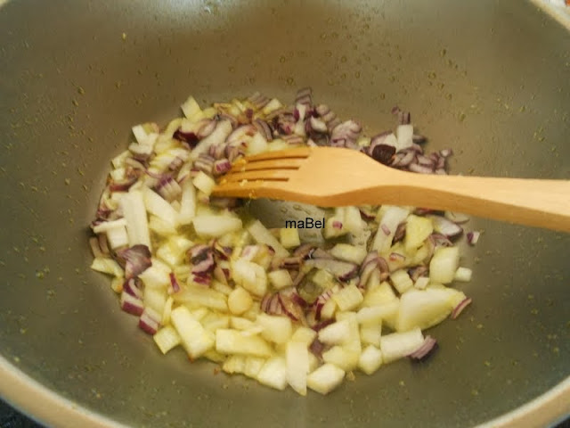 ene se mismo aceite, doramos las cebollas. Puedes colocar rajitas de chile seco o fresco, o sino tiras de pimiento rojo, mas o menos medio pimiento