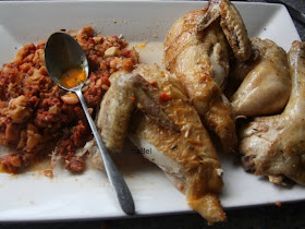 quitamos el relleno, que servimos como acompañamiento y troceamos el pollo, lo servimos con la salsa de limón