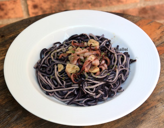 Para la salsa, simplemente lamino ajos y corto en tiras el calamar, y los frio en aceite de oliva. Primero doro un poco el ajo, luego las finas tiras de calamar y en un minuto está hecho