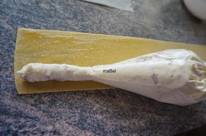 Pincelar la masa con huevo batido, para que se adhiera el relleno y se quede la masa pegada por los extremos. Colocar una tira de relleno con un par de cucharas, o bien con una manga pastelera, y enrollar el relleno con la masa, formando un tubo largo