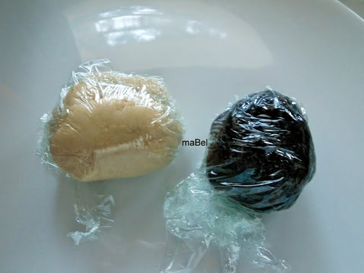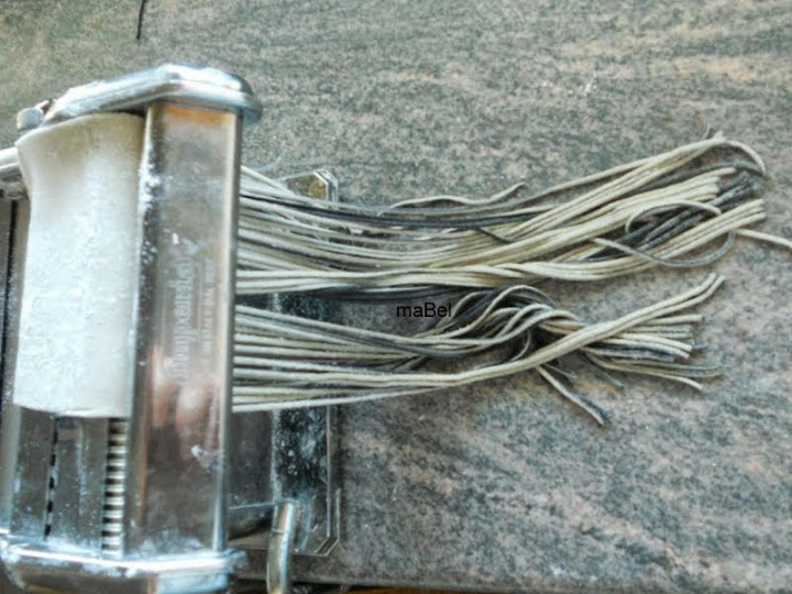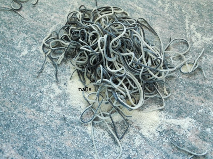 una vez formada la masa, la dividimos en 2 partes, a una le agregamos la tinta de calamar, amasamos, y si necesita, le incorporamos 1 cdita mas de harina