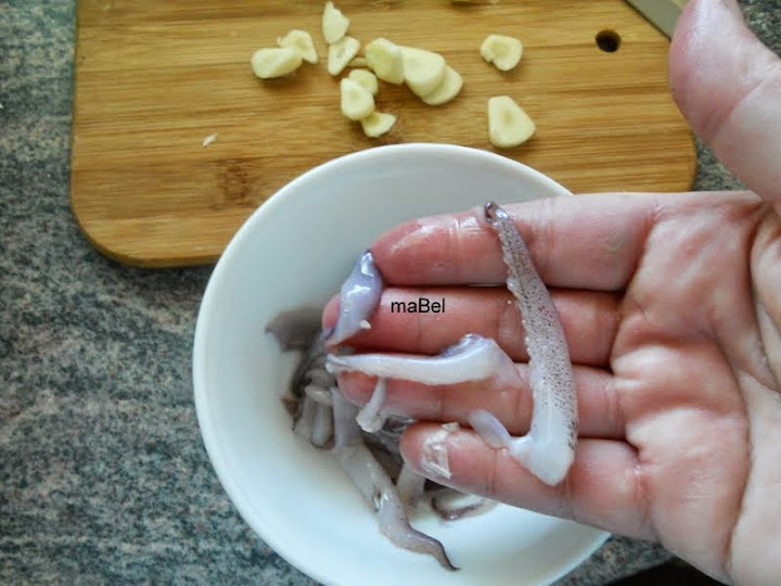 Para la salsa, simplemente lamino ajos y corto en tiras el calamar, y los frio en aceite de oliva. Primero doro un poco el ajo, luego las finas tiras de calamar y en un minuto está hecho